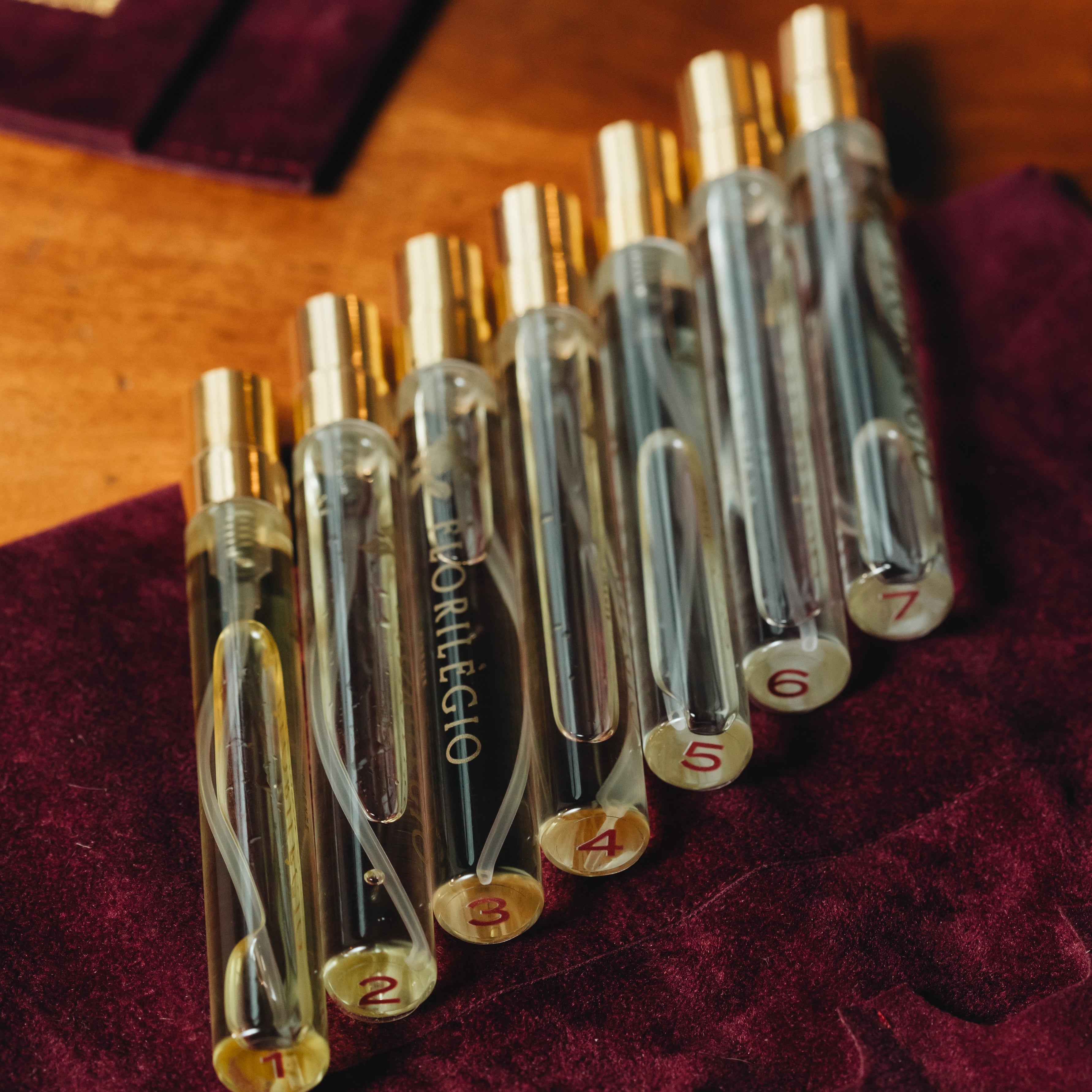 The seven fragrances are kept in velvet: